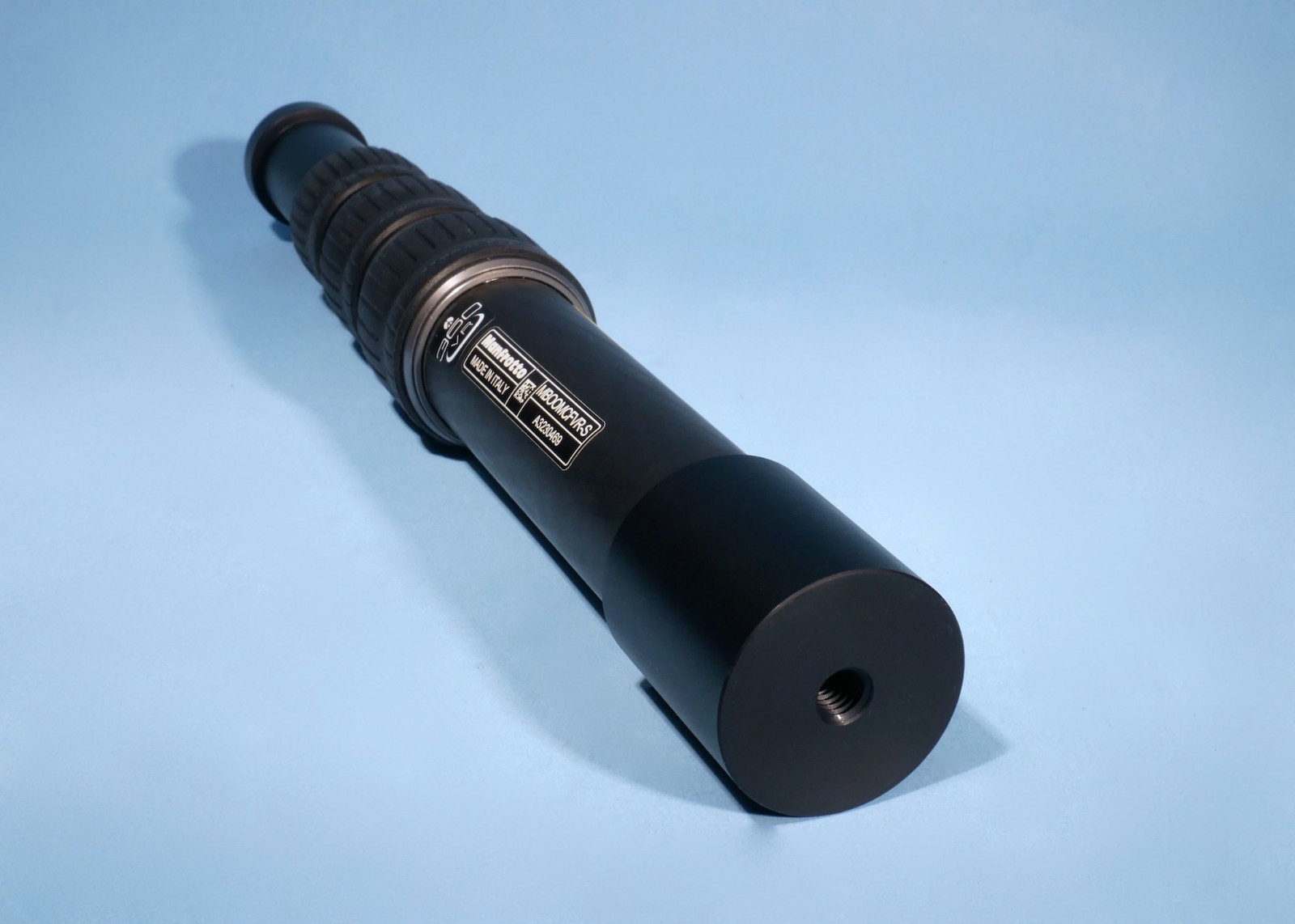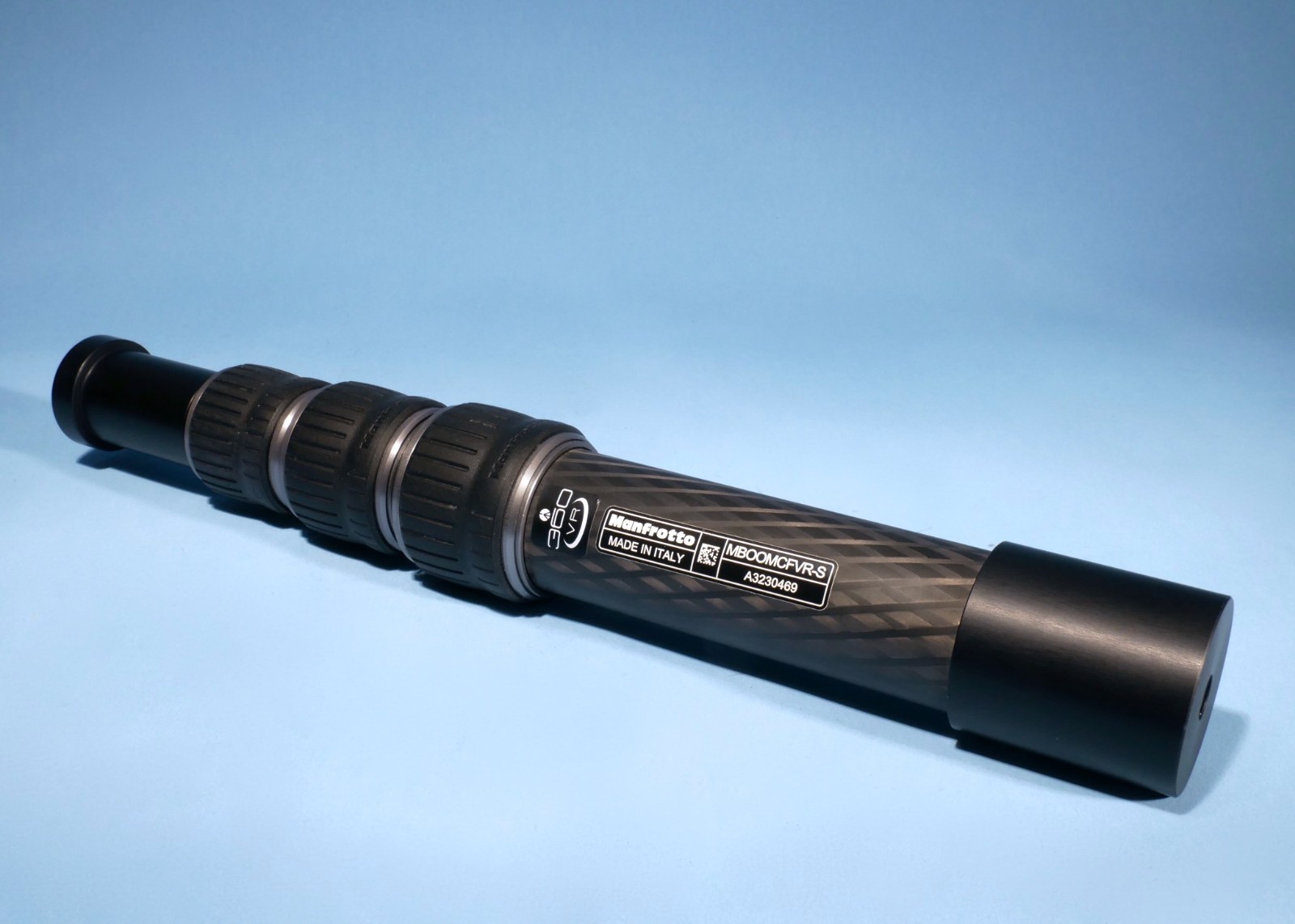 The Manfrotto MBOOMCFVR-S is a 4-section, compact carbon fiber extension boom designed for 360° cameras, featuring a 2kg payload, 33cm–80cm height range, and a double-sided mount (1/4” to 3/8”). It provides extreme rigidity to minimize vibration, making