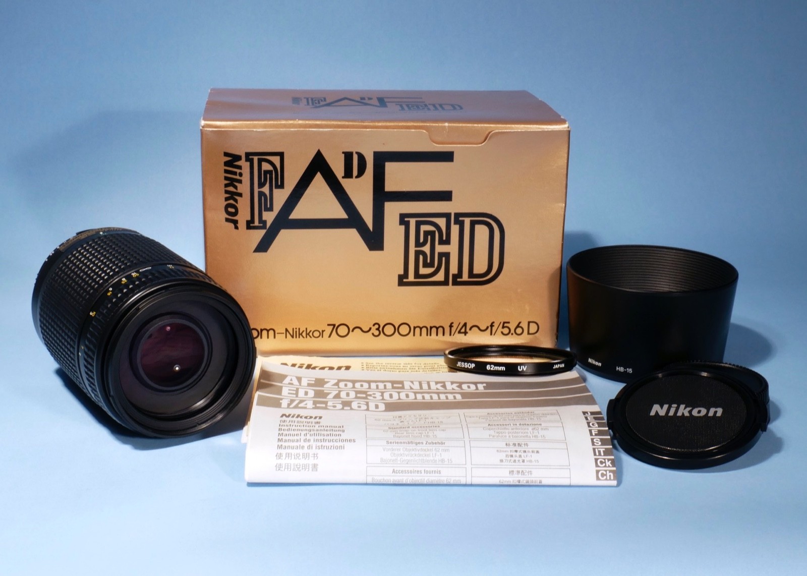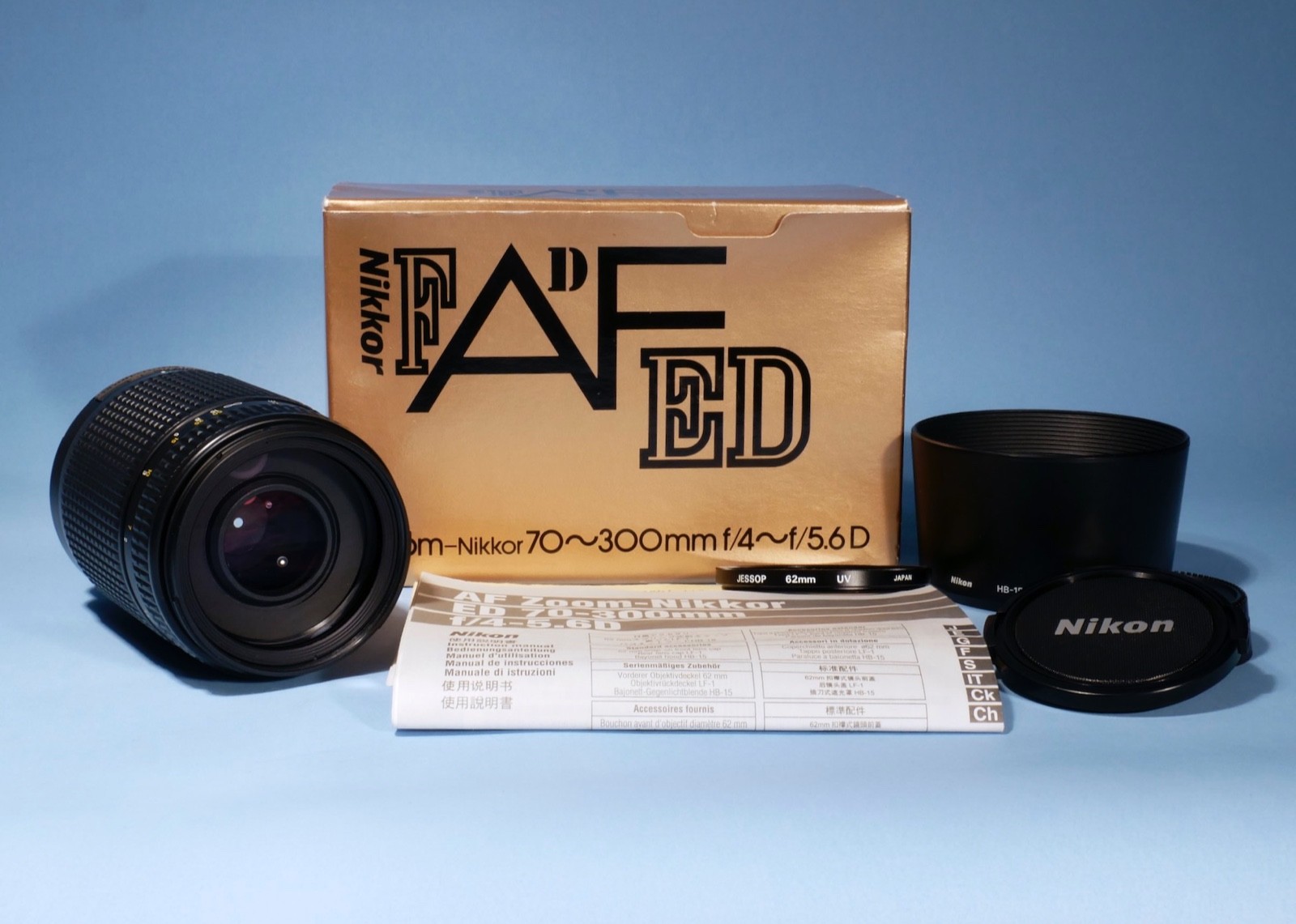 Complete with lens caps, hood, filter, instructions & box.